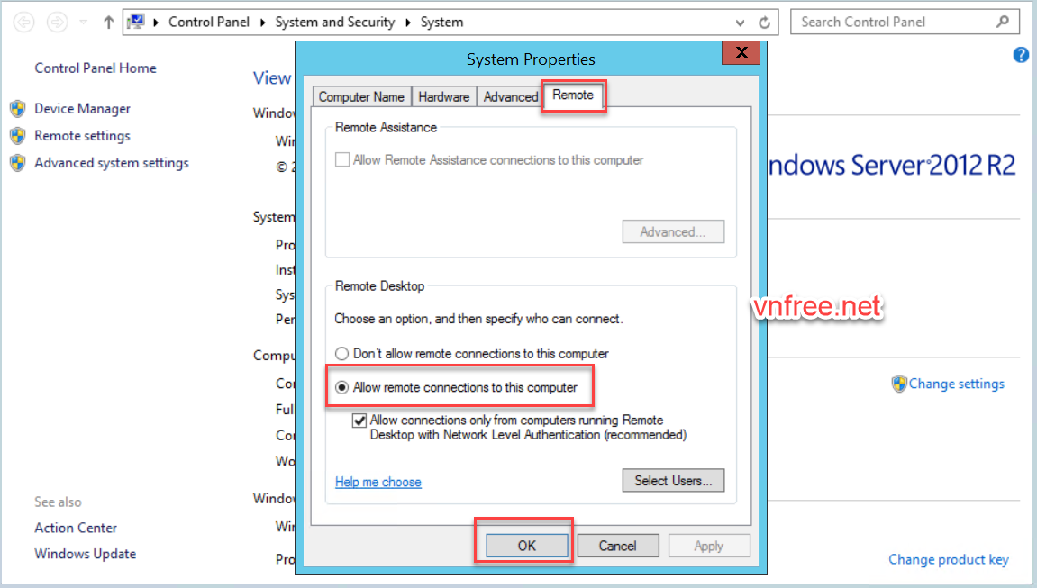 Allow Remote connections to this computer rồi