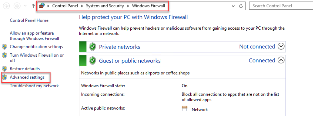 Control Panel\System and Security\Windows Firewall chọn