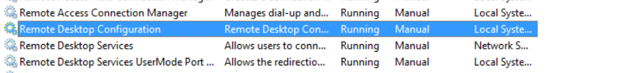 Remote Desktop Configuration đang Running, nếu không bạn click phải chuột và start nó lên.