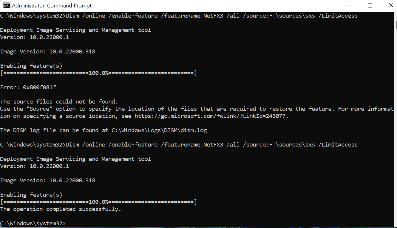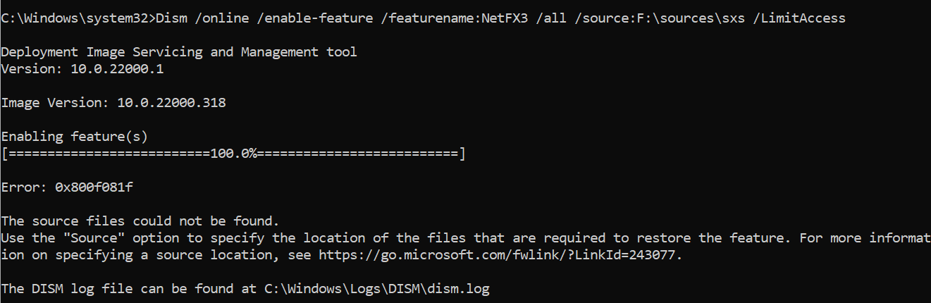 Dism /online /enable-feature /featurename:NetFx3 /All /Source:F:\sources\sxs /LimitAccess