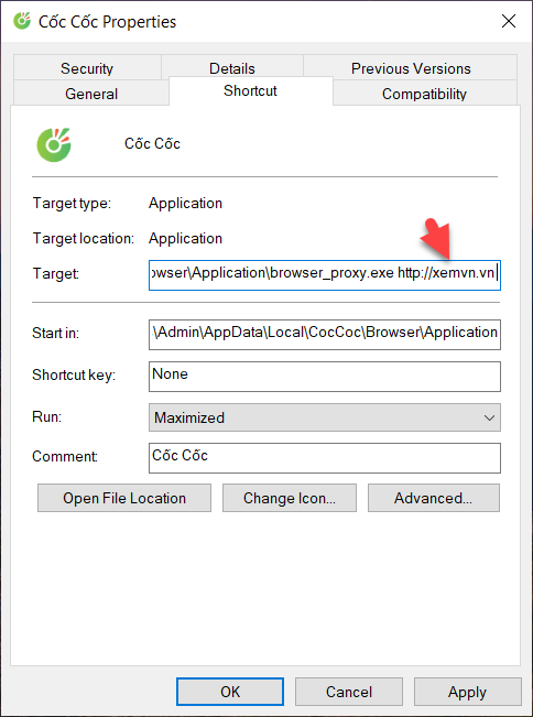 - Bạn xóa các liên kết phía sau của Brower.exe ở hình 1 đi => sau đó nhấn Apply = OK