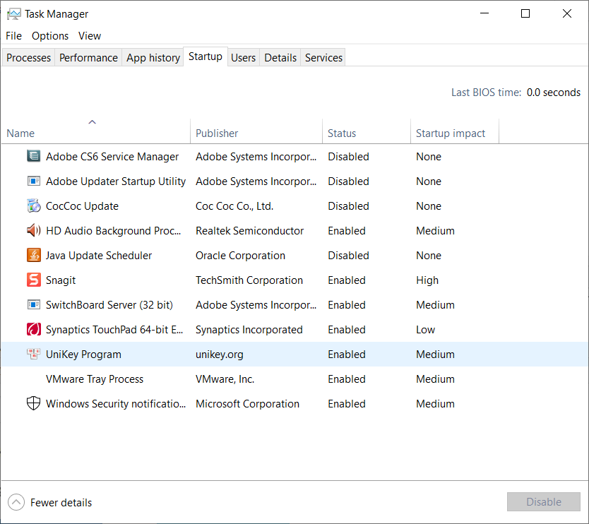 Task Manage => mục Startup ( HÌnh 4) để xem có phần mềm nào đáng nghi chạy khởi động cùng hệ thống không, và tắt nó đi.