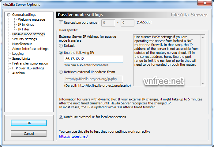 * Nếu bạn muốn các máy Client ở dải mạng ngoài, không nằm trong cùng mạng LAN với bạn kết nối đến máy chủ thì cần xác định IP của máy chủ được NAT ra trên thiết bị tường lửa ở dài ngoài, sau đó thiết lập trong mục Passive mode settings => chọn Use the followind IP (Hình 10)