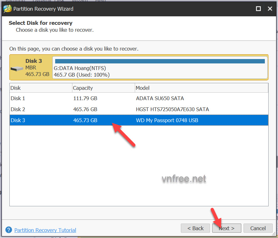 4. Một danh sách các ổ cứng trên máy tính hiện ra, tiếp tục chọn đúng ổ cứng cần khôi phục dữ liệu => sau đó nhấn