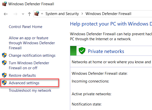 Control Panel\System and Security\Windows Defender Firewall trên windows 10