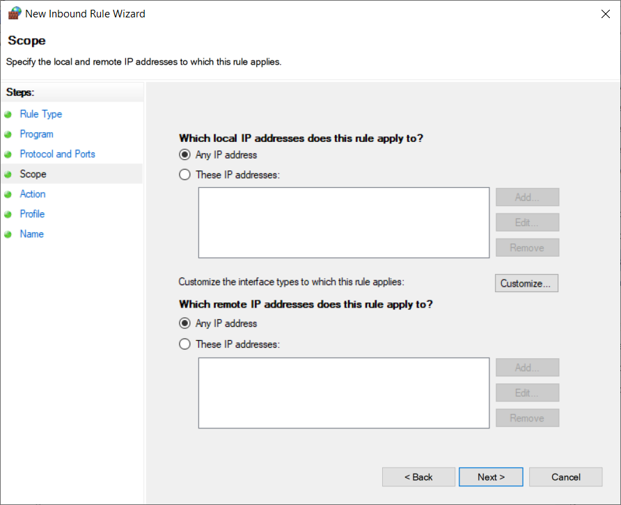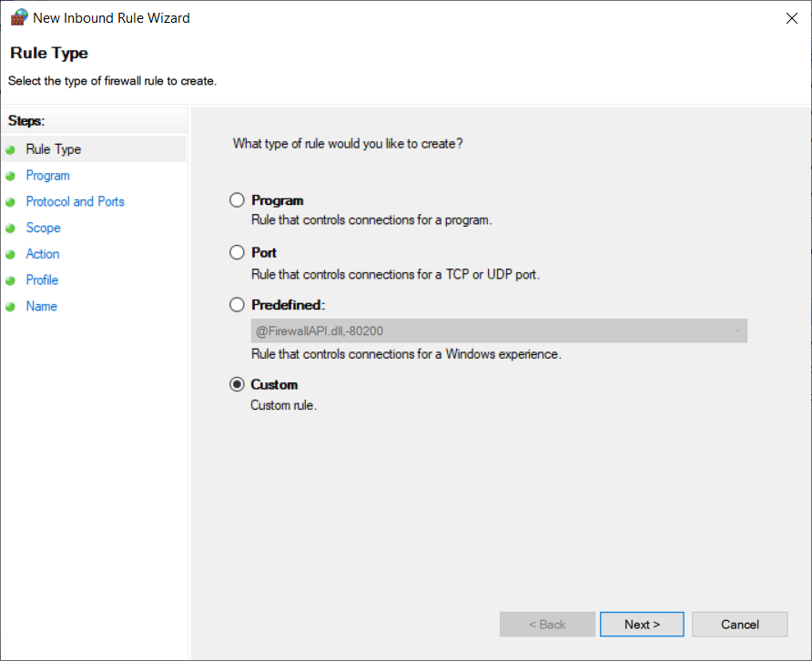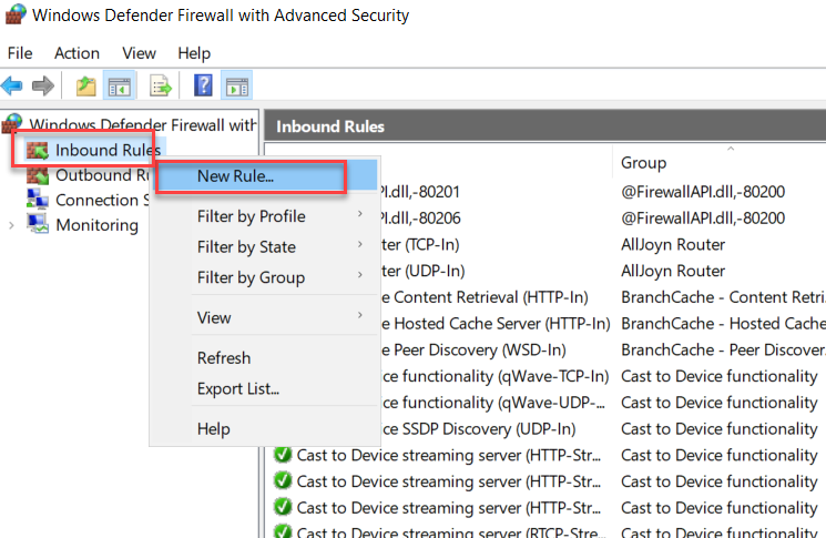 Inbound Rules => chọn New Rule