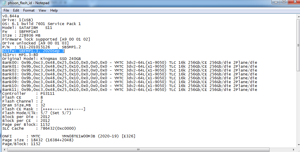 S11fw: SBFMP1.3, 2020Sep 3 chứa phiên bản fw ổ cứng là SBFMP1.3 và ngày năm của fw là 2020Sep 3