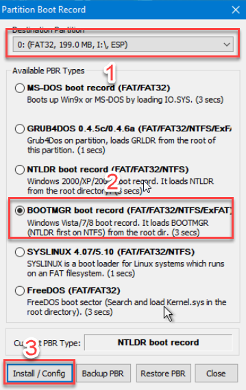 BOOTMGR boot record (FAT/FAT32/NTFS/ExFAT): Bạn sử dụng lựa chọn này để thực hiện nạp PBR cho các phiên bản Windows 7 trở về sau.