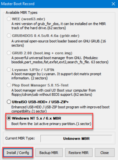 Windows NT 6.x MBR: Lựa chọn này để thực hiện nạp MBR cho các phiên bản từ Windows 7 trở về sau.