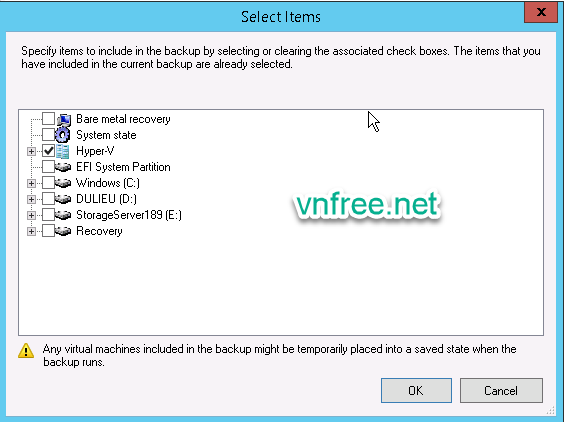 - Bước 6: Bước này bạn chọn thư mục, hoặc ổ đĩa nào muốn sao lưu. Ở đây mình muốn sao lưu các máy chủ ảo Hyper-V nên chọn Hyper-V