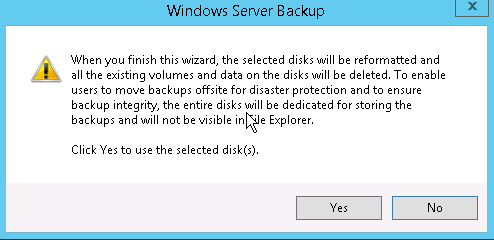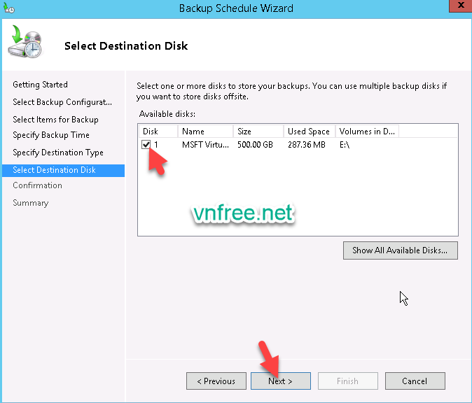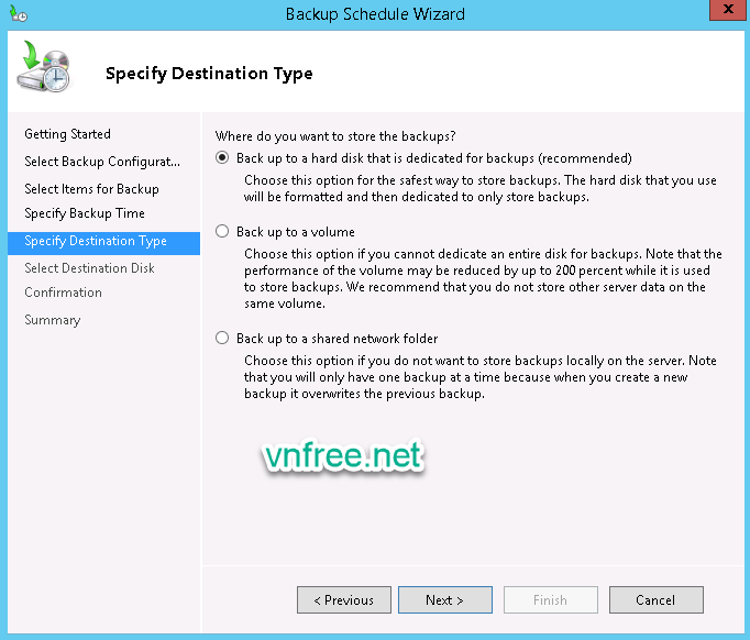 + Back up to hard disk that is dedicated for backups : lưu file backup trên 1 ổ cứng khác ( nên sử dụng, lựa chọn này sẽ định dạng lại ổ đĩa được chọn và ổ đĩa này sẽ được dành riêng cho việc sao lưu. Như trong ví dụ này mình sẽ sử dụng ổ đĩa iSCSI SAN 500GB, lựa chọn này sẽ format và ẩn ổ đĩa đó đi để dành riêng cho việc sao lưu này ).
