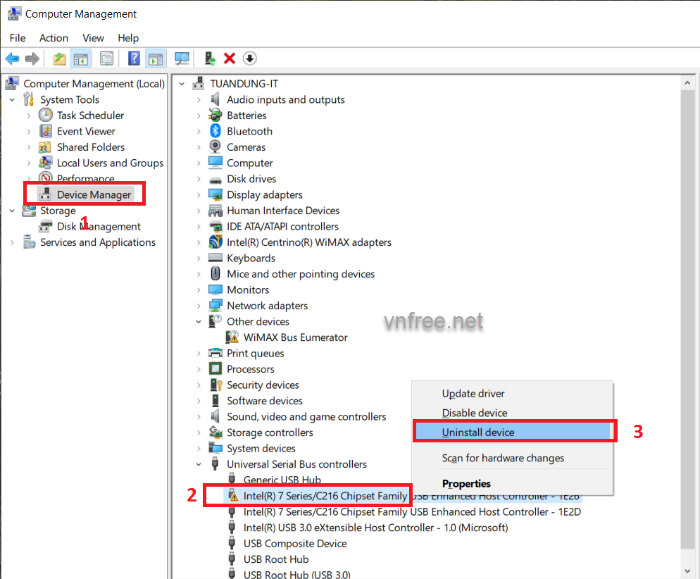 universal serial bus controller có mục nào bị đánh dấu vàng không. Trong Hình 1, máy tính mình bị lỗi cổng USB báo chấm than màu vàng. Bạn phải chuột vào cổng đó (Shift + F10) => Chọn