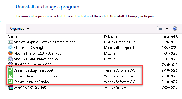 Uninstall or change a program sẽ thấy các dịch vụ của Veeam đã được tự động thêm vào để quản lý (hình 22)