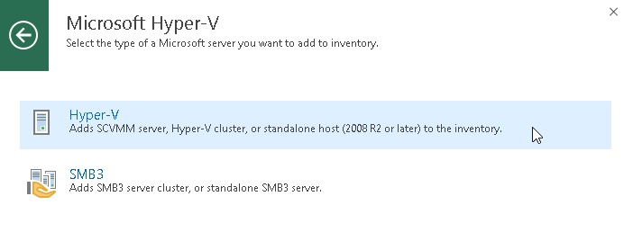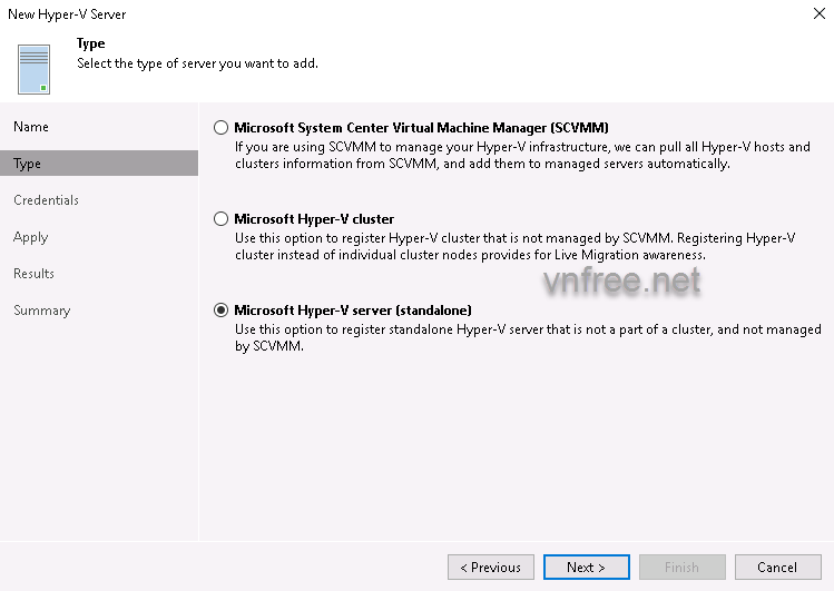 + Microsoft Hyper-V server (standalone): Lựa chọn này giúp có thể kết nối các Host Hyper-V chưa kết nối vào cluster có thể được quản lý bởi Veeam.