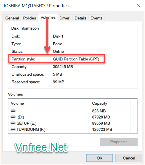 Tìm đến Tab Volumes, nếu Partition styles là Master Boot Record (MBR) thì ổ cứng định dạng MBR. Còn ổ cứng là GUID Partition Table (GPT) tức ổ cứng định dạng GPT.